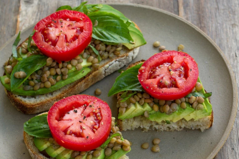 Doručak: kriška smeđeg hleba i jedan paradajz.