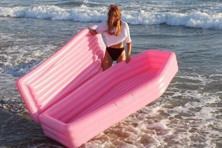 Kanadski dizajneri Endrju Grinbaum i Ijan Felton dizajnirali su roze mrtvački sanduk na naduvavanje, koji će oni koji se odluče da ga kupe moći ovoga leta da koriste umesto dušeka za plažu ili gumenog čamca.