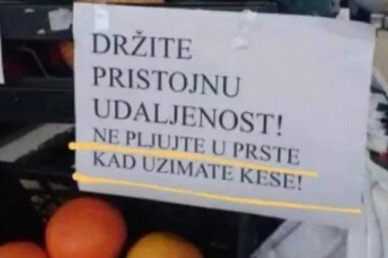 Foto: printscreen/facebook.comNaime, radnici su postavili natpis "Držite pristojnu udaljenost! Ne pljujte u prste kad uzimate kese".