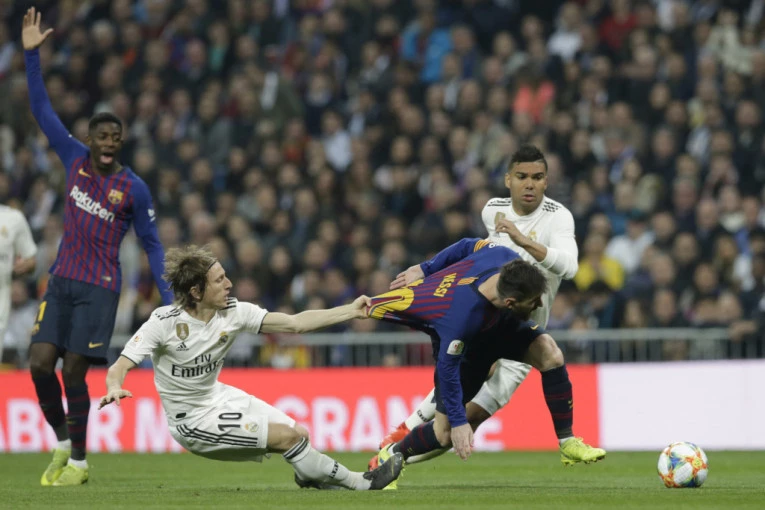 Foto: Tanjug/ApReč je o kadru u kojem Luka Modrić u padu za majicu povlači Lionela Mesija kako bi zaustavio njegov prodor prema golu kraljevskog kluba.