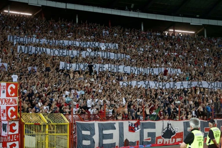 Foto: Starsport"Delije" su istakle transparent na kojem su bili stihovi pesme Jovana Dučića "Horda" i poručili šta misle o tome što se u komšiluku slavi ubijenje 1.800 Srba i proterivanje njih 250.000 iz Krajine.