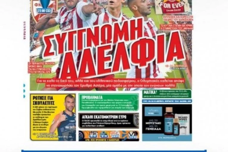 Foto: Danijel KokanovićNaslovi popularnog medija "Sportime", fudbalerima grčkog velikana daju dodatnu dozu motivacije pred meč za treće mesto.