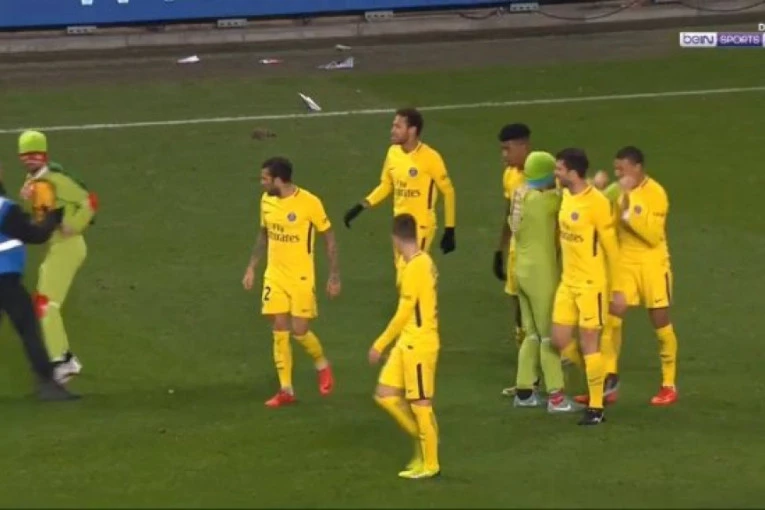 Foto: streamable.com/PrintscreenPetnaest minuta pre kraja meča dvojica navijača u kostimima Nindža kornjača spustili su se na teren pored obezbeđenja i slavili gol sa fudbalerima PSŽ-a.