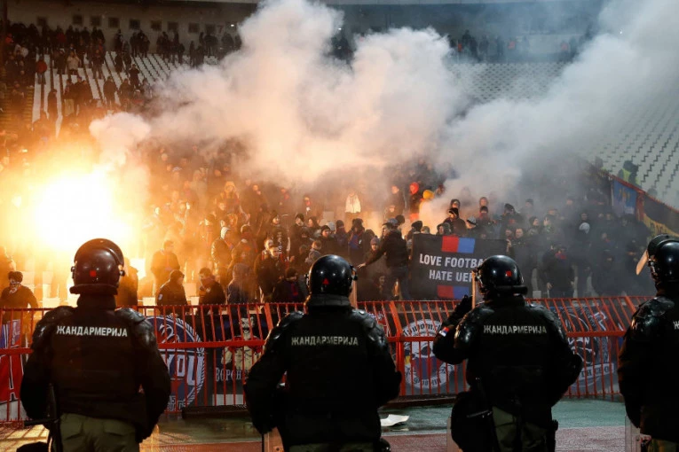 Foto: StarsportNavijači CSKA, koji su bili smešteni na južnoj tribini stadiona "Rajko Mitić", palili su baklje i petarde i ubacivali ih na atletsku stazu. Gust dim početkom drugog poluvremena prekrio je stadion i otežao odigravanje meča.