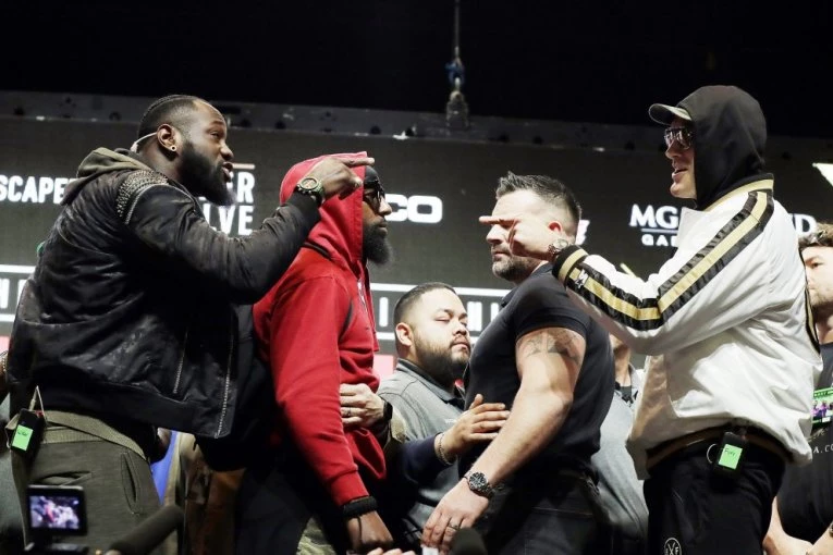 Foto: Tanjug/AP- Ali ti ne veruješ u Davida i Golijata, beskorisni stvore! Trenirao sam kao lud, ne možeš me baciti na pod. Prestani da me guraš - izustio je Fjuri, a Vajlder ga je odgurnuo. Umešalo se obezbeđenje koje je stalo između dva boksera.