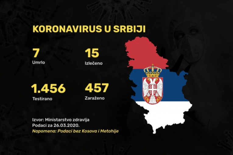 U Republici Srbiji je do 15 časova 26. marta 2020. godine registrovano ukupno 457 potvrđenih slučajeva COVID 19.