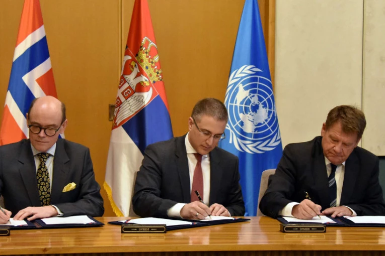 Potpredsednik Vlade Republike Srbije i ministar unutrašnjih poslova dr Nebojša Stefanović, ambasador Kraljevine Norveške u Beogradu Arne Sanes Bjornestad i šef Kancelarije Ujedinjenih nacija za projektne usluge u Srbiji Grem Tindal potpisali su danas u Beogradu Memorandum o razumevanju za sprovođenje projekta "Podrška Kraljevine Norveške Ministarstvu unutrašnjih poslova".