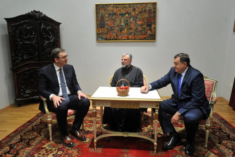 Foto: Tanjug/D. GOLLVladika je, nakon obilaska radova na obnovi Saborne crkve Svete trojice u Mostaru sa predsednikom Srbije Aleksandrom Vučićem i RS Miloradom Dodikom, rekao da je srećan što je imao priliku da to učini sa dva predsednika srpskog naroda.