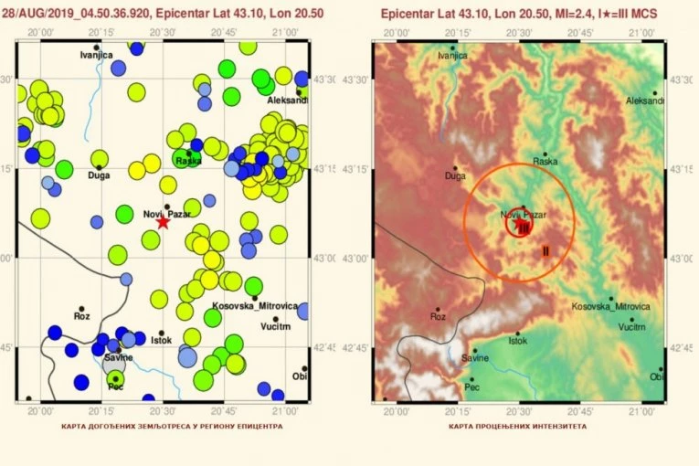 Potres se osetio u regionu mesta Novi Pazar, saopštio je Republički seizmološki zavod na svom sajtu. Intezitet u epicentru procenjen je na III stepena Merkalijeve skale.
