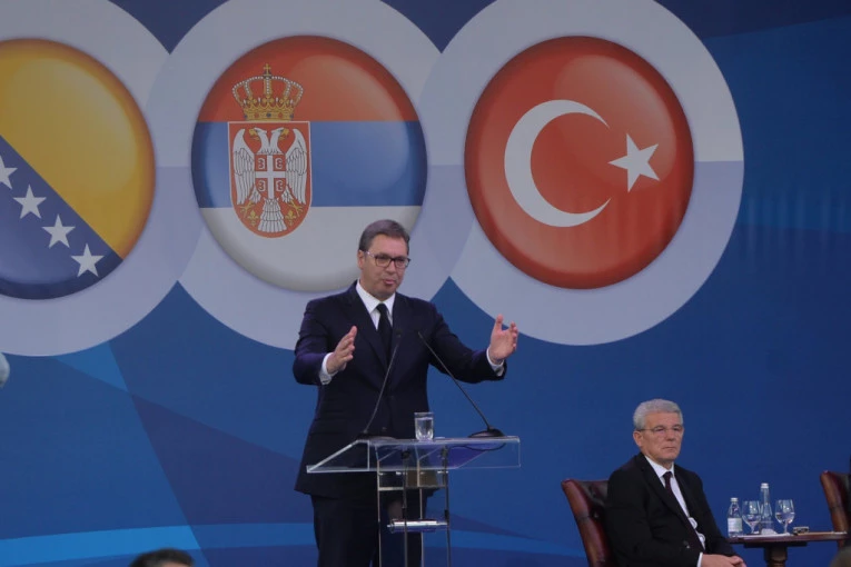 Vučić je, na početku obraćanja, zamolio prisutne da velikim aplauzom pozdrave goste, pre svega Erdogana i prijatelje iz BiH.