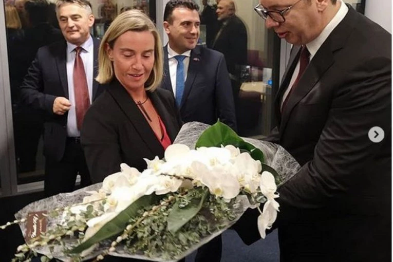 Foto: instagram.com/buducnostsrbijeavPrisustvujući oproštajnoj radnoj večeri koju je u Briselu priredila visoka predstavnica EU za spoljnu i bezbednosnu politiku Frederika Mogerini, Vučić je iskoristio priliku i poklonio joj cveće.