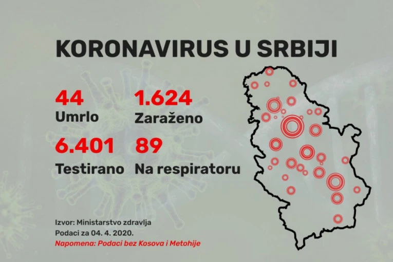 U Republici Srbiji je do 15 časova 4. aprila 2020. godine registrovano ukupno 1.624 potvrđenih slučajeva COVID 19.