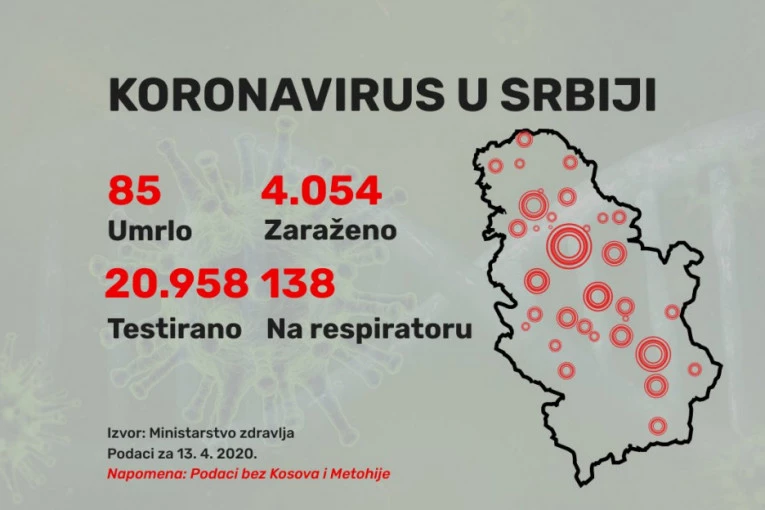 U Republici Srbiji je do 15 časova 13. aprila 2020. godine registrovano ukupno 4.054 potvrđenih slučajeva COVID 19.