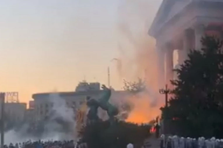 Foto: Twitter.com/BalkanInsightOni najekstremniji demonstranti koji se nalaze ispred stepeništa zgrade Skupštine bacili su baklje i suzavac na pipadnike policije koji obezbeđuju zgradu Skupštine.
