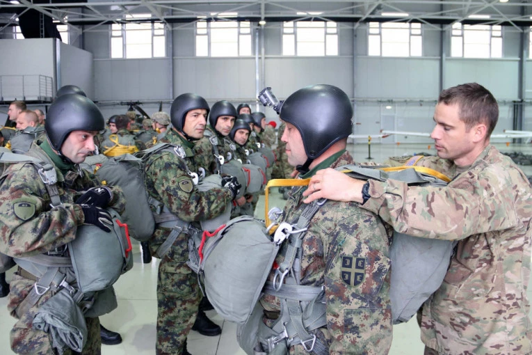 Foto: Tanjug/ G. STANKOVIĆKako navodi Ministarstvo odbrane u saopštenju, nešto posle 10 časova s batajničkog aerodroma put vojvođanske ravnice krenula su dva američka aviona C-130 "Herkules“ iz kojih su u 11 časova počeli da iskaču srpski i američki padobranci.