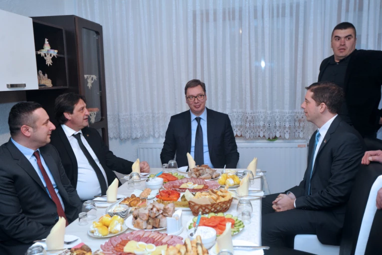 Foto: Tanjug/D. GOLLVučić je domaćinu čestitao slavu, deci podelio poklone, a potom, na molbu domaćina, seo u čelo slavskog stola.