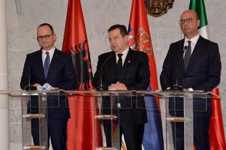 Foto: Tanjug/O. STEVANOVIĆDačić je na konferenciji za novinare u vili "Mir", gde se sastao sa ministrima spoljnih poslova Italije i Albanije, odbacio tvrdnju Bedžeta Pacolija da Dačić navodno nudi oružje u zamenu za povlačenje odluke o priznanju nezavisnosti Kosova.