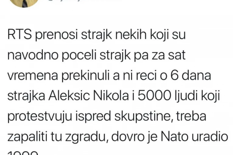 Foto: twitter.com/Djordje VisekrunaNa Tviteru je prvo poručio da je odlično što je NATO bombardovao RTS i da bi ga trebalo opet spaliti. A potom je pružio podršku Nikoli Aleksiću koji štrajkuje i pozvao ga da uzme pištolj ili bombu i da jednog povede sa sobom u smrt.