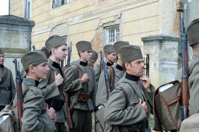 Foto: Promo fotoMladi glumci i statisti u ulogama golobradih vojnika, rezervista i seljaka koji su pošli u rat, počeli su snimanje scenom regrutacije i dolaska u kasarnu. Glumac Marko Vasiljević, koji tumači istorijsku ličnost Stevana Jakovljevića, i Vuk Jovanović koji igra njegovog ratnog druga Aleksandra, imali su scenu upoznavanja. Pomoć mladim glumcima pristigla je od iskusnih kolega Ljube Bandovića i Aleksandra Đurice.