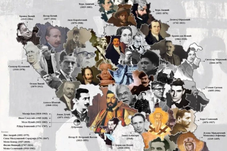 OVO je karta Srbije, BiH i Republike Srpske sa VELIKANIMA SRPSKE KNJIŽEVNOSTI!