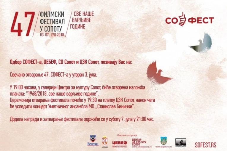 Otvaranjem izložbe plakata "1968-2018, sve naše varljive godine" i koncertom Umetničkog anasambla "Stanislav Binički" pod dirigentskom palicom Vojkana Borisavljevića, sutra u Centru za kulturu u Sopotu počinje 47. Filmski festival "Sofest".