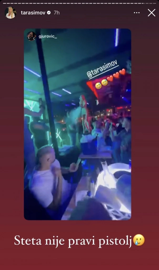 Naime, ona je celu noć objavljivala snimke iz provoda, na kojima se vidi da se ludo provodi, dok Ša sedi nedaleko od nje. Međutim, ona se u jednom trenutku popela na sto i uzela dimni pištolj i usmerila ga ka reperu, na šta se on u prvi mah ukočio jer mu nije bilo jasno šta se dešava, a onda odmahivao glavom, a ona je uz opis videa napisala: