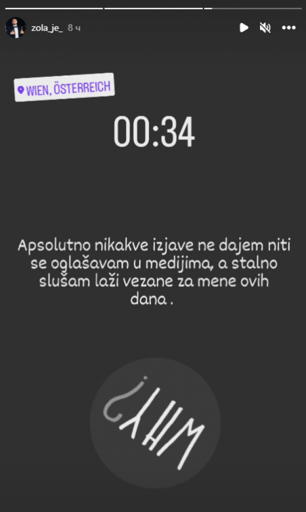 Bivši takmičar "Elite" Lazar Čolić Zola, koji je samoinicijativno napustio rijaliti, od juče se nalazi u Beču. Svoj put najavio je nakon bežanja iz "Elite", a sinoć se ponovo oglasio na društvenoj mreži Instagram. Zola je posla sata posle ponoći okačio stori na ovoj mreži, te ponovio da još uvek neće davati izjave predstavnicima sedme sile.