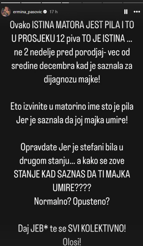 - Ovako, istina! Matora jeste pila i to u proseku 12 piva, to je istina... Ne 2 nedelje pred porođaj, već od sredine decembra kad je saznala za dijagnozu majke! Eto, izvinite u Matorino ime što je pila, jer je saznala da joj majka umire! Opravdate, jer je Stefani bila u drugom stanju... A kako se zove stanje kad saznaš da ti majka umire? Normalno? Opušteno? Dajte! Je**te se svi kolektivno! Ološi! - napisala je Ermina Pašović na Instagram profilu.