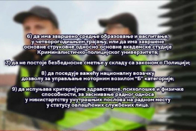 "To su obično policijske uprave jer raspisujemo konkurse za svih 27 policijskih uprava. Da ima završeno srednje obrazovanje u četvorogodišnjem trajanju ili da ima završene osnovne ili strukovne studije Kriminalističko-policijskog univerziteta ukoliko su u pitanju svršeni studenti Kriminalističko-policijskog univerziteta. Da nemaju manje od 18 i ne više od 24 godine starosti, odnosno da nemaju više od 27 godina ukoliko su to u pitanju svršeni studenti Kriminalističko-policijskog univerziteta“, napominje Radović.
