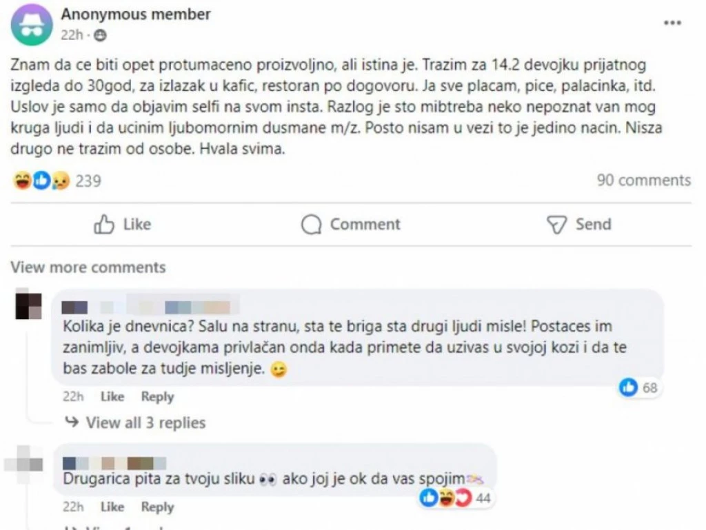 Tako je jedan mladić iz Srbije, nešto pre 14. februara i Dana zaljubljenih, odlučio da postavi oglas i traži devojku za izlazak, samo da dušmani pokaže i da on može da je ima.