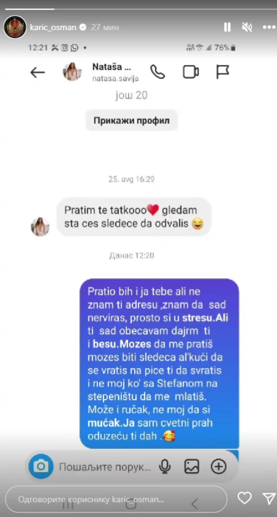 - Pratio bih i ja tebe, ali ne znam ti adresu, znam da se sad nerviraš, pošto si u stresu. Ali ti sad obećavam, dajem ti i besu. Možeš da me pratiš, možeše biti sledeća, ali kući da se vratiš, na piće ti da svratiš. I nemoj ko sa Stefanom na stepeništu da me mlatiš. Može i ručak, nemoj da si mućak. Ja sam cvetni prah, oduzeću ti dah - odgovorio joj je Osman i dodao emotikon sa srčićima oko lica.