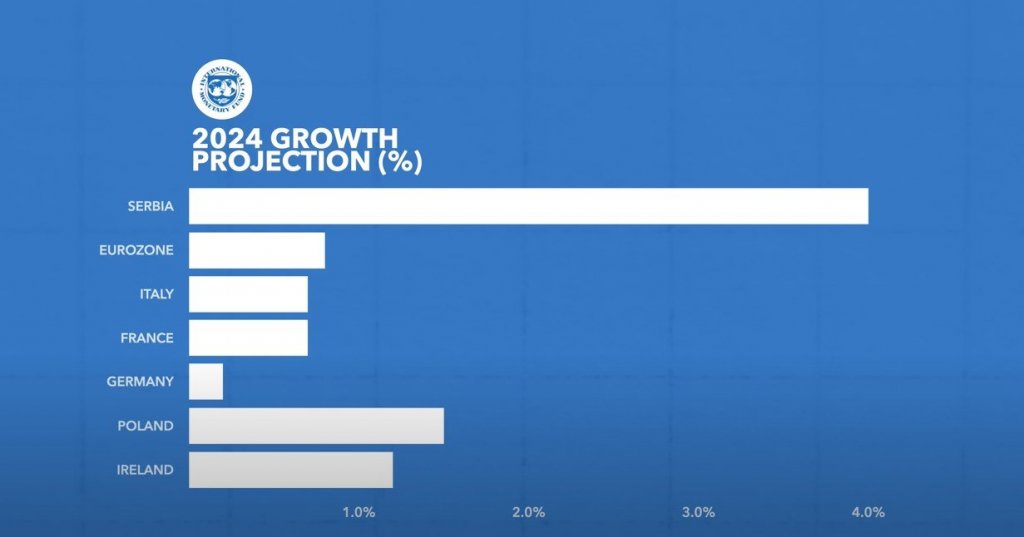 Prognoze kažu da će srpski BDP u 2024. godini dostići neverovatnih 4%, što je mnogo iznad onog projektovanog za evrozonu, gde prognoze predviđaju rast od 0.8%. Za isti period, Francuskoj i Italiji predviđaju rast od svega 0.7%, dok je Nemačka u velikom ekonomskom problemu i za nju se očekuje rast od 0.2%.