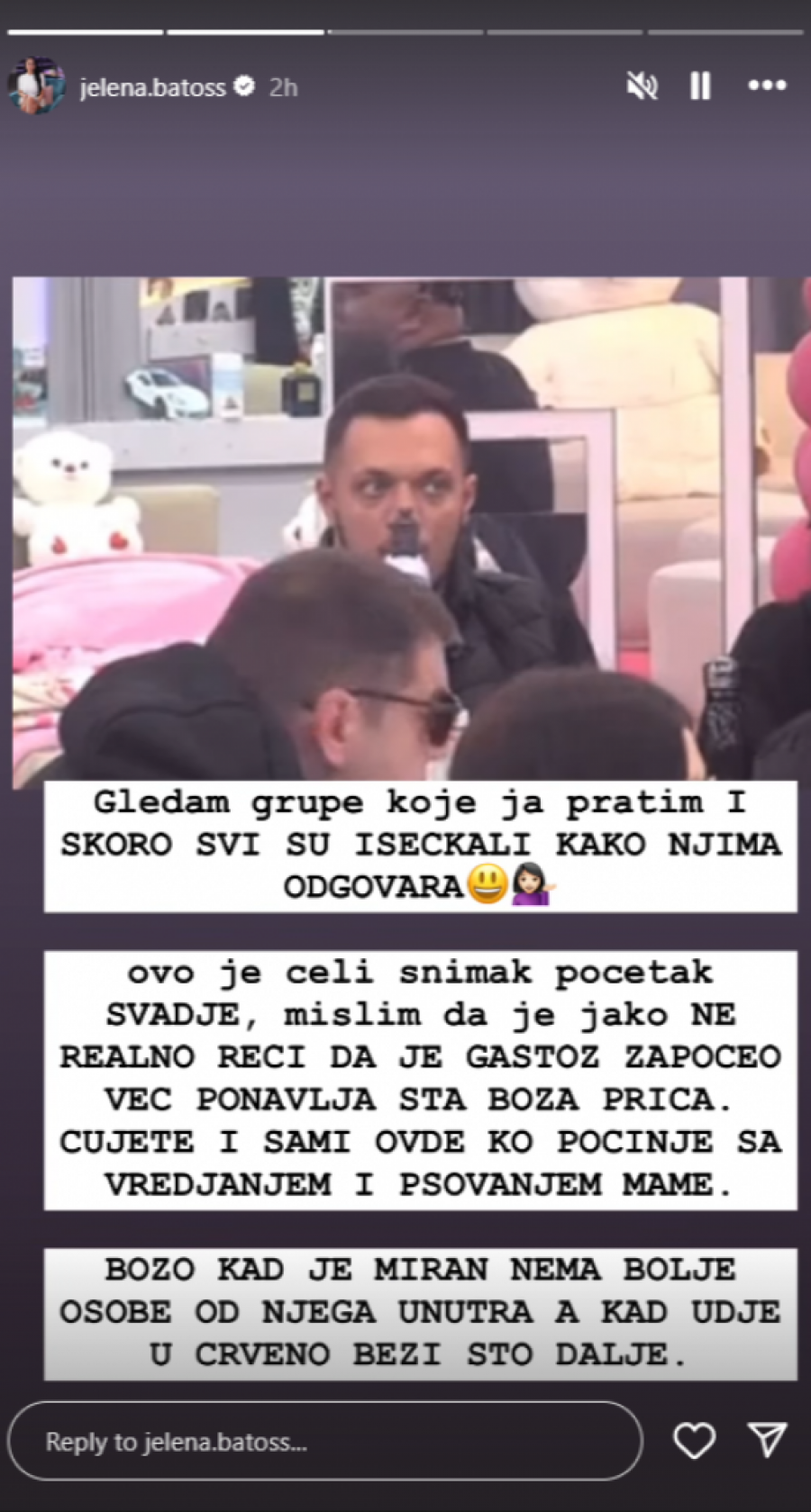 - Gledam grupe koje ja pratim i skoro svi su isekali kako njima odgovara. Ovo je celi snimak i početak svađe, mislim da je jako nerealno reći da je Gastoz započeo, već on ponavlja šta Boža priča. Čujete i sami ovder ko počinje sa vređanjem i psovanjem mame. Božo kad je miran nema bolje osobe od njega, a kad uđe u crveno, beži što dalje - napisala je bivša zadrugarka uz snimak koji je šokirao čitavu javnost.