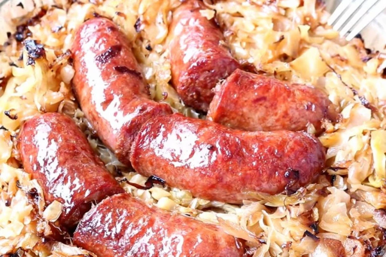 Dodati mlevenu papriku, biber i sve izjednačiti. U podmazan pleh na dno staviti restovan krompir, a odozgo kupus. U sredinu staviti kobasice. Možete ih preseći na pola. Premazati uljem i peći u rerni oko 30 minuta da se sve lepo zapeče. Prijatno!