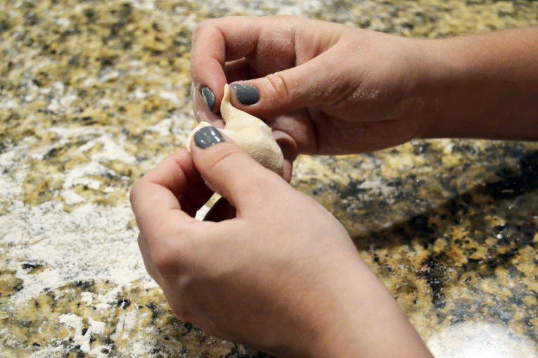Krompir oljuštite i skuvajte. Procedite ga odmah nakon kuvanja, dodajte 30 gr putera, izgnječite u pire i ostavite da se prohladi. Napravite testo od ohlađenog krompira, brašna, jajeta i još 50 gr omekšalog putera.
