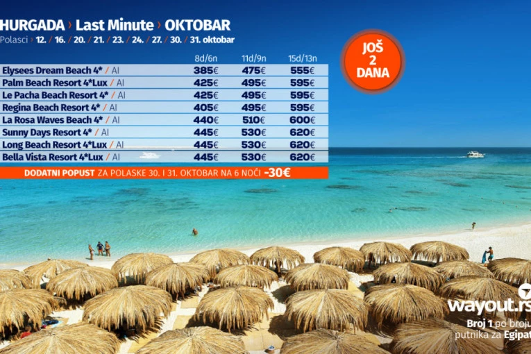 Ukoliko još uvek niste stigli da rezervišete svoje putovanje, bez mnogo razmišljanja, definitvno, najsigurniji i najpovoljniji izbor ove jeseni je Hurgada i odmor na prelepim plažama Crvenog mora, a za sve one koji bi da što pre pobegnu od svakodnevnih obaveza, spremili smo neodoljivu LAST MINUTE koja se odnosi na poslednja mesta, kako u avionima, tako i u hotelima za polaske u oktobru, kao i SPECIJALNU PONUDU za polaske u novembru.