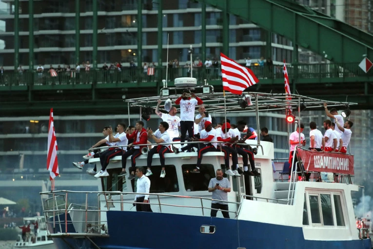 Foto: StarsportFudbaleri i stručni štab Crvene zvezde na fenomenalan način proslavljaju četvrtu uzastopnu titulu prvaka Srbije, ploveći brodom po Savi.