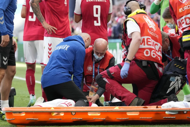 Njega su ekspresno pokušali da reanimiraju danski lekari, a posle desetak minuta Eriksen je na nosilima napustio teren, a može se videti da je priljučen na kiseonik.