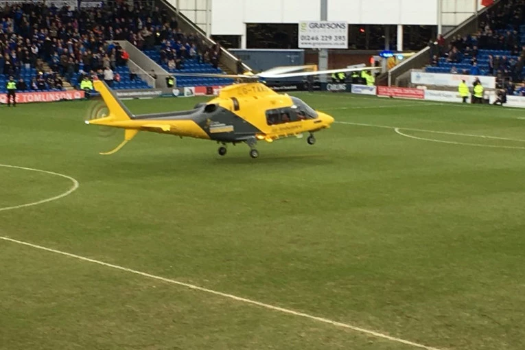 Foto: twitter.com/ChesterfieldFCPošto lekarska ekipa koja je bila na stadionu nije mogla da pomogne ovom navijaču, nadležni su zatražili pomoć da bolnica pošalje helikopter.