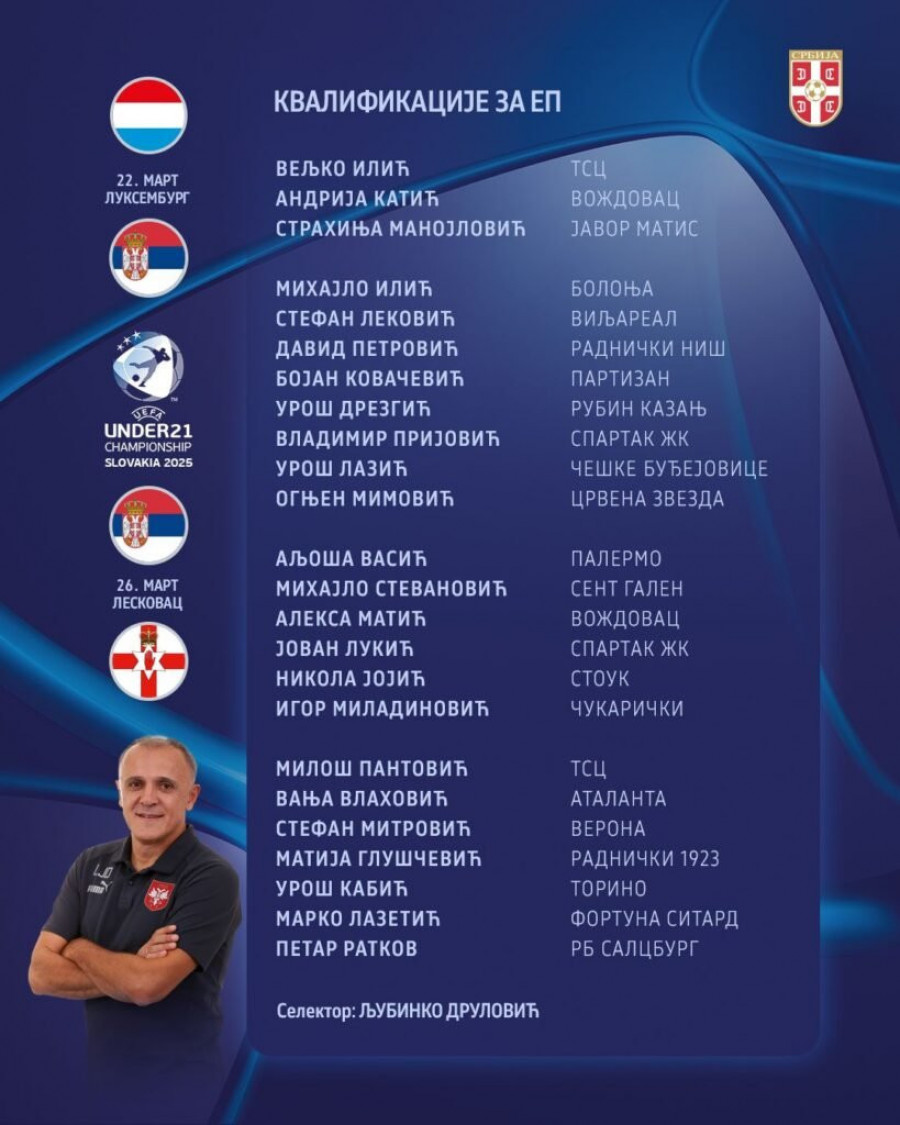"Orlići" (igrači do 21 godine) će 22. marta započeti svoj niz kvalifikacionih utakmica gostovanjem u Luksemburgu, a četiri dana kasnije će dočekati selekciju Severne Irske u Leskovcu. Ovi mečevi su od izuzetne važnosti za srpske reprezentativce, koja se bori za plasman na Evropsko prvenstvo 2025. godine u Slovačkoj.