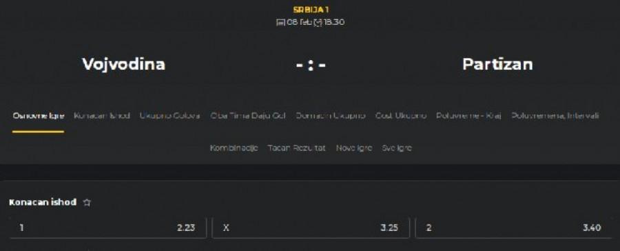 Naime, Vojvodina je apsolutni favorit za osvajanje sva tri boda. Kvota na trijumf novosadske ekipe iznosi 2,23, dok će svako ko uloži jedan dinar na trijumf aktuelnog srpskog vicešampiona, a u koliko do njega i dođe, inkasirati čak 3,40.