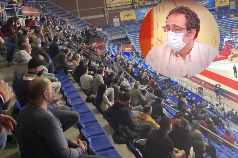 Foto: twitter.com/printscreenEvroliga dozvoljava određen ograničen broj ljudi u delegaciji svakog kluba, ali utisak je da se na jednom tribini u "Pioniru" nalazilo znatno više od dozvoljenog prema kovid protokolu, zbog čega je reagovao i imunolog dr Srđa Janković.