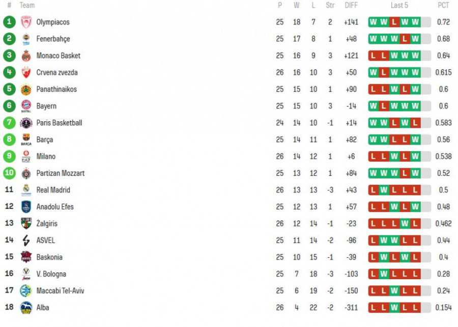 Ono što svakako izaziva veliku pažnju navijača Crvene zvezde, ali i kompletne sportske i košarkaške javnosti u Srbiji, jeste trenutno stanje na evroligaškoj tabeli.
