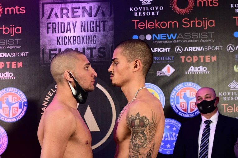 Foto: ARENA FRIDAY NIGHT FIGHTSSudeći po spisku borbi, ali pre svega po mrštenju i mrkim pogledima koje smo mogli da vidimo na zvaničnom merenju boraca - prštaće u ringu! Ljubitelji kik boksa u direktnom TV prenosu na specijalizovanom kanalu Arena Fight uživaće u sedam uvodnih borbi, a centralni meč je megdan za upražnjeno mesto profesionalnog prvaka sveta WAKO PRO federacije u kategoriji do 66,8 kilograma, disciplina lou kik, između našeg najboljeg kik boksera Aleksandra Konovalova i Portugalca Andre Santoša.