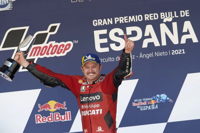 Foto: Tanjug/APVozač Dukatija Džek Miler trijumfovao je u Heresu u trci za VN Španije, ispred klupskog kolege Banjaja, te Morbidelija koji se takođe popeo na postolje.