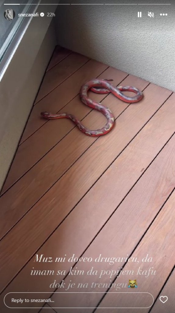 Na prvoj objavi Snežana se pohvalila da je Milan na treningu, ali da joj je ostavio društvu u stanu - neobičnog kućnog ljubimca u vidu zmije. Videla je Sneža Borjanovu zmiju, pa se pohvalila pratiocima uz poruku: