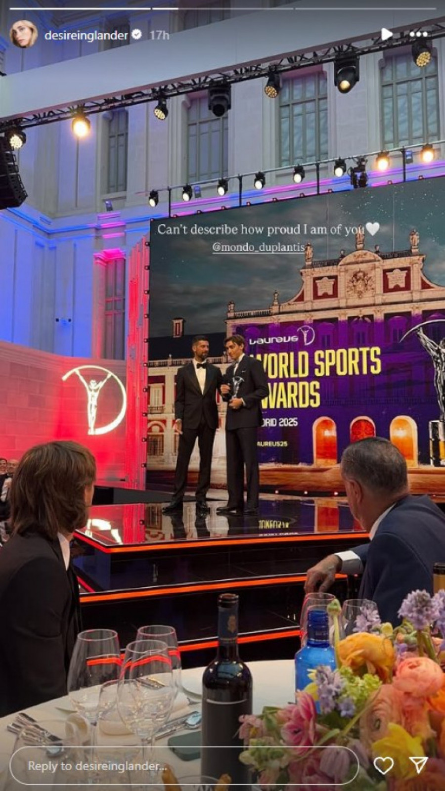 Što je trenutak još posebniji, nagradu mu je uručio Novak Đoković, prošlogodišnji dobitnik ovog prestižnog priznanja. Ovaj momenat je izazvao veliku pažnju na društvenim mrežama, a posebno je emotivno reagovala Duplantisova verenica, Dizajer Inglander, koja je podelila svoje ponosne osećaje putem društvenih mreža. Izjavila je: