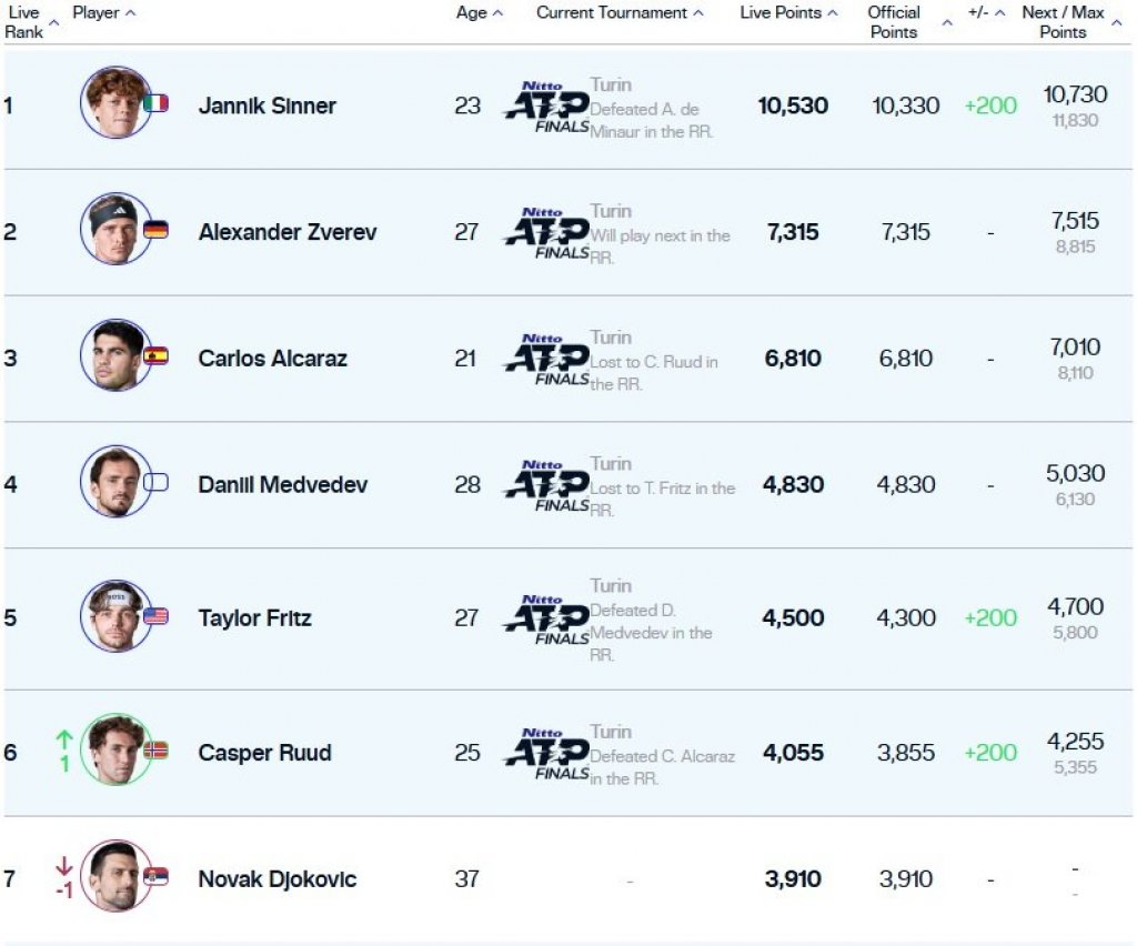 Norveški teniser Kasper Rud ostvario je značajan uspeh na Završnom turniru u Torinu pobedivši Karlosa Alkaraza rezultatom 2:0 (6:1, 7:5). Nakon ove pobede, Rud je osvojio dodatnih 200 bodova, čime stiže do ukupnih 4.055 bodova. Time je on prestigao Novaka Đokovića na ATP listi, s obzirom da Đoković trenutno ima 3.910 bodova. Od sledećeg ponedeljka, Kasper Rud će se naći na šestom mestu ATP liste, dok će Đoković biti sedmi.