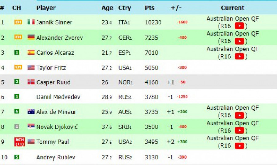 Ukoliko bismo gledali ATP listu koja se iz dana u dan formira po osnovu ostarenih rezultata u Melburnu, Novak Đoković je slkiznuo na osmu poziciju i u ovom momentu ima 3.500 poena, dok je Alkaraz i dalje treći igrač planete sa 7.010 bodova.