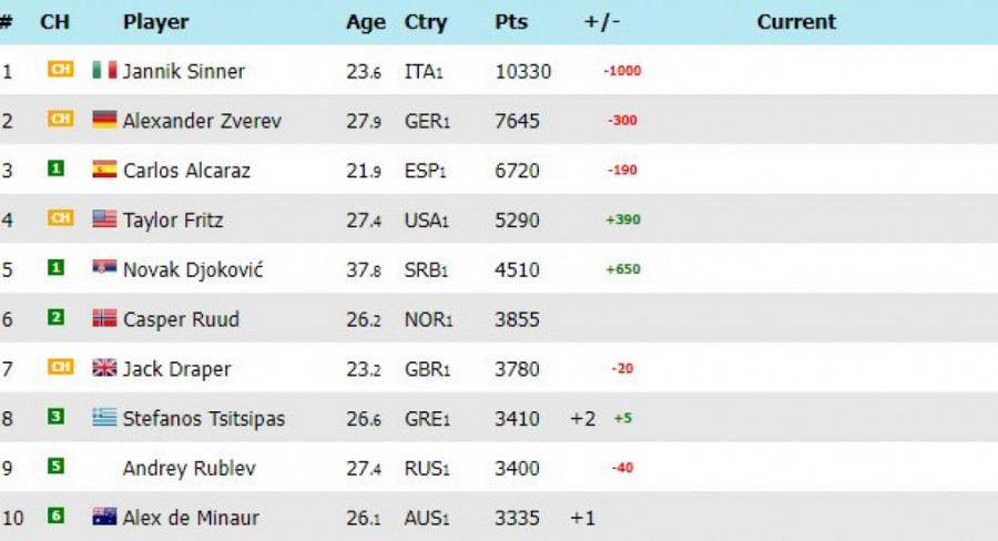 Kasper Rud je šesti sa 3,855 bodova, dok je Džek Drejper sedmi sa 3,780 bodova. Stefanos Cicipas je napredovao dva mesta i sada je osmi sa 3,410 bodova, a Andrej Rubljov se drži devete pozicije sa 3,400 poena. Deseti je Aleks de Minor sa 3,335 bodova.